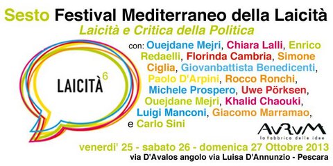 Il VI Festival Mediterraneo della Laicità, con la direzione scientifica di Giacomo Marramao, si svolgerà il 25, 26 e 27 ottobre 2013, come le precedenti edizioni, presso l’Aurum di Pescara e avrà per tema Laicità e Critica della Politica.