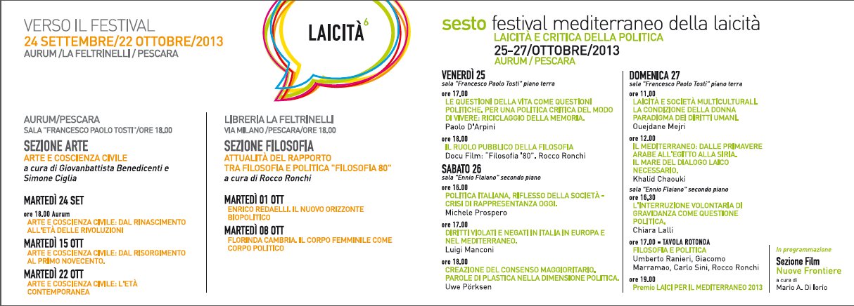 Domenica 27 ottobre 2013 la mattina Aurum sala “Francesco Paolo Tosti” piano terra alle 11.00 Ouejdane Mejri, Presidente di Pontes, associazione italo-tunisina, ci parlerà del lavoro svolto per il dialogo fra questi paesi e della condizione, in particolare, delle donne; alle 12.00 Khalid Chaouki, porterà un contributo di analisi sul “Mediterraneo delle Primavere Arabe,dall’ Egitto alla Siria. Il mare del dialogo necessario delle laicità; pomeriggio alle 17.00 Aurum Sala Flaiano, la tavola rotonda dedicata a “Filosofia e Politica” vedrà la partecipazione di Giacomo Marramao, Umberto Ranieri, Carlo Sini e Rocco Ronchi alle 19.00 con l’assegnazione del “Premio Laici per il Mediterraneo 2013″ si chiuderà la sesta edizione del Festival Mediterraneo della Laicità.