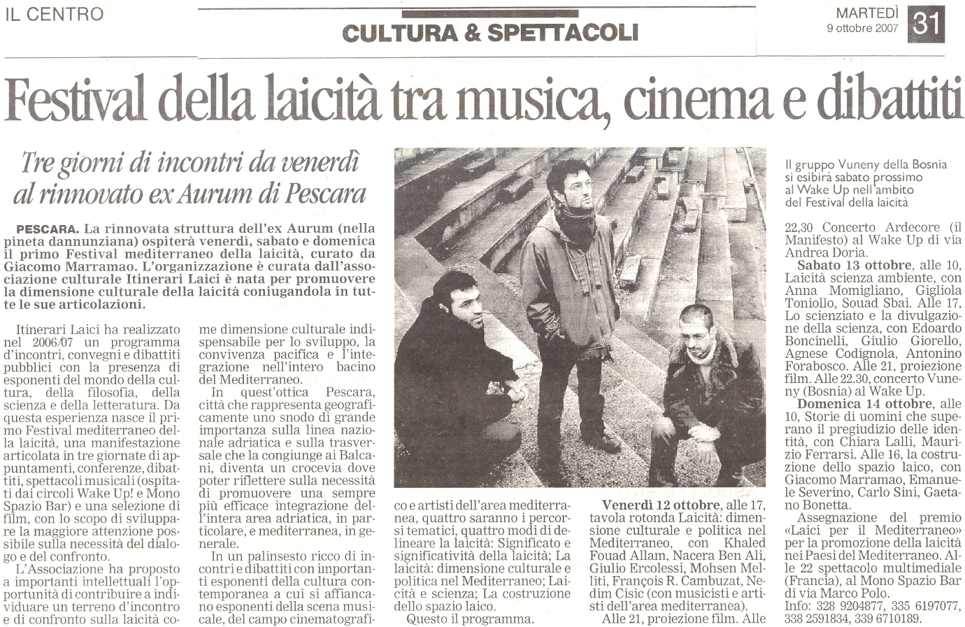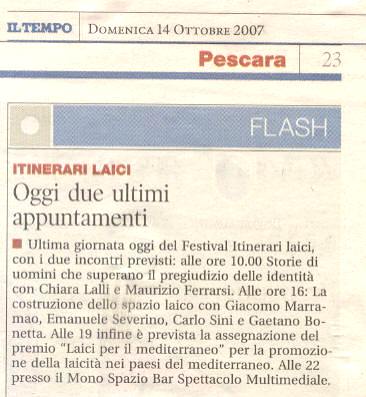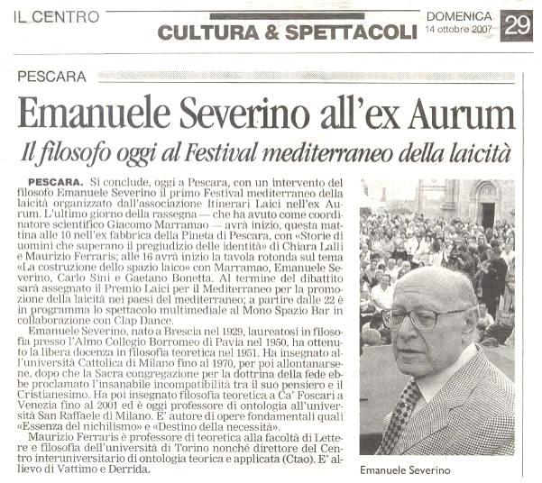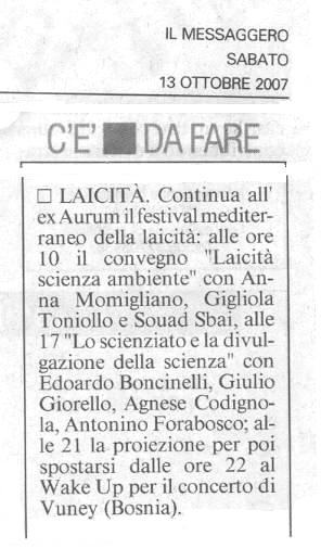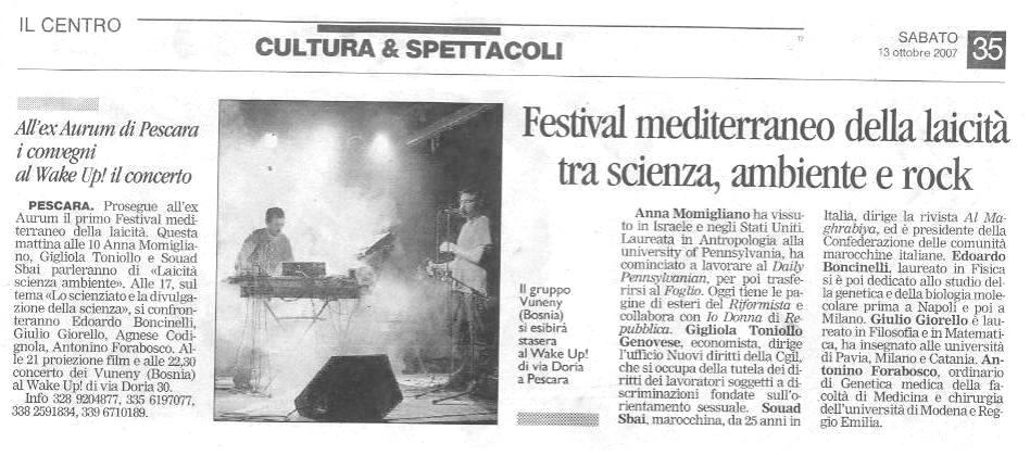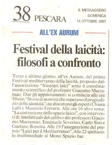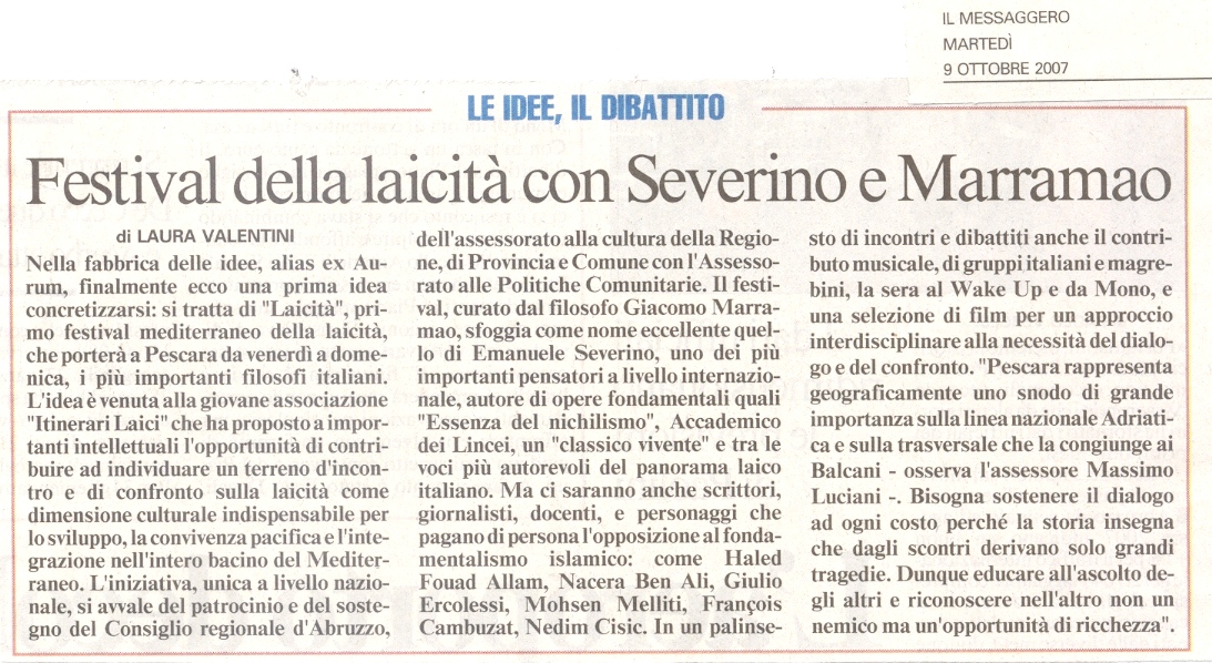 Rassegna stampa 2007 itinerari-admin Rassegna Stampa 5 maggio 2006 Comments 14 ottobre Il Centro Emanuele Severino all’ex Aurum 14 ottobre l Messaggero Festival della laicità: filosofi a confronto 14 ottobre Il Tempo Itinerari Laici. Oggi due ultimi appuntamenti 14 ottobre Abruzzo Reporter Giordano Bruno, l’ostinato eretico 14 ottobre pescasseroli.biz pescasseroli.biz:80/indice_abruzzo.asp?id=2513&mode=detail 13 ottobre Il Centro Festival mediterraneo della laicità tra scienza, ambiente e rock 13 ottobre Il Messaggero Laicità 13 ottobre newson.it newson.it/modules.php?name=News&file=article&sid=10517 13 ottobre kronic Festival Mediterraneo della Laicità: Dal 12 al 14 Ottobre a Pescara 13 ottobre http://abruzzoblog.com abruzzoblog.blogspot.com/2007/10/festival-mediterraneo-della-laicit-oggi.html 12 ottobre Carovana per la costituzione Primo Festival Mediterraneo della Laicità 11 ottobre http://bioetiche.com http://bioetiche.blogspot.com/2007/10/festival-della-laicit.html 11 ottobre sensopposto.it http://www.sensopposto.it/?p=40 11 ottobre http://fiak.wordpress.com/ Laboratorio sulla Laicità 10 ottobre Leggimi 1° Festival Mediterraneo della laicità a Pescara 09 ottobre Il Centro Festival della laicità tra musica, cinema e dibattiti 09 ottobre Il Messaggero Festival della laicità con Severino e Marramao 09 ottobre tutto abruzzo oggi e molise L’ex Aurum apre le porte al festival della laicità 08 ottobre abruzzo24ore.tv abruzzo24ore.tv/abruzzo24ore/Default.asp=25&m=2&grp1=1&grp2=7&idse=2084& 08 ottobre primadanoi.it primadanoi.it/modules/news/article.php?storyid=1417 05 ottobre Audiodrome.it 06/10/07 Mediterranean Festival of Laity 05 ottobre nogod.it italialaica.it/cgi-bin/news/view.pl?id=007660 05 ottobre italialaica.it italialaica.it/cgi-bin/news/view.pl?id=007660 05 ottobre abruzzoliberale.it abruzzoliberale.it/index.php?option=com_content&task=view&id=864&Itemid=39 05 ottobre http://sdchieti.ilcannocchiale.it sdchieti.ilcannocchiale.it/post/1637929.html 04 ottobre artistsandbands.org/ita artistsandbands.org/ita/modules/news2/article.php?storyid=321 04 ottobre musicclub.it/ http://www.musicclub.it/musicclub/jsp/festival/default_one.jsp?id_festival=1190 3 ottobre osservatoriomediterraneo.org osservatoriomediterraneo.org/comment.php?comment.news.37 3 ottobre viaoberdan.it viaoberdan.it/index.php?option=com_content&task=view&id=365&Itemid=2 3 ottobre audioglobe.it audioglobe.it/news/news07399.asp 3 ottobre www.kronic.it/ kronic.it/artGet.aspx?aID=3&sID=7136&fID=4&tID=308985&page=2 2 ottobre www.perlarosanelpugno.it perlarosanelpugno.it/1festival-mediterraneo-della-laicita-121314-ottobre-vp8744.html 2 ottobre www.bed-and-breakfast.it bed-and-breakfast.it/evento.cfm?idevents=68371&idregione=1 2 ottobre www.musicclub.it musicclub.it/musicclub/jsp/festival/default_one.jsp?id_festival=11900163894780 2 ottobre www.tgroseto.net Pescara, Primo Festival Mediterraneo della Laicita’ dal 12 al 14 ottobre 2007 10 giugno Audiodrome.it Festival 12 marzo www.themalinformazione.it themalinformazione.it/themawebpages/news/news2/2032.htm 12 marzo www.online-news.it online-news.it/default.php?page=show&articolo=2096&argomento=Abruzzo 09 marzo www.tgroseto.net tgroseto.net/giovanni-boniolo-a-pescara-per-un-incontro-conferenza-sulla-laicita/ 05 marzo www.pandla.tv pandla.com/web/blog.php?id=227#35 23 febbraio www.agenziastra.it agenziastra.it/notizia.php?action=visualizza_notizia&id=44968 23 febbraio www.abruzzoreport.com abruzzoreport.com/news/default.asp?id=2052 23 febbraio www.provincia.pescara.it provincia.pescara.it/magazinedetail.asp?id=61MC2109455&sezione=ter 23 febbraio www.tgroseto.net tgroseto.net/darwin-day-anniversario-della-nascita-di-darwin 22 febbraio www.italialaica.it italialaica.it/cgi-bin/news/view.pl?id=006770 22 febbraio http://casoli.iobloggo.com http://casoli.iobloggo.com/archive.php?eid=2437403 22 febbraio www.tuttoabruzzo.it tuttoabruzzo.it/index.php?option=com_content&task=view&id=6146&Itemid=1&pop=1&page=0 tuttoabruzzo.it/index.php?option=com_content&task=view&id=6146&Itemid=464 22 febbraio www.primadanoi.it primadanoi.it/modules/news/article.php?storyid=570 22 febbraio www.online-news.it online-news.it/default.php?page=show&articolo=1814&argomento=Attualit%C3%A0 22 febbraio www.newson.it newson.it/modules.php?name=News&file=article&sid=9003